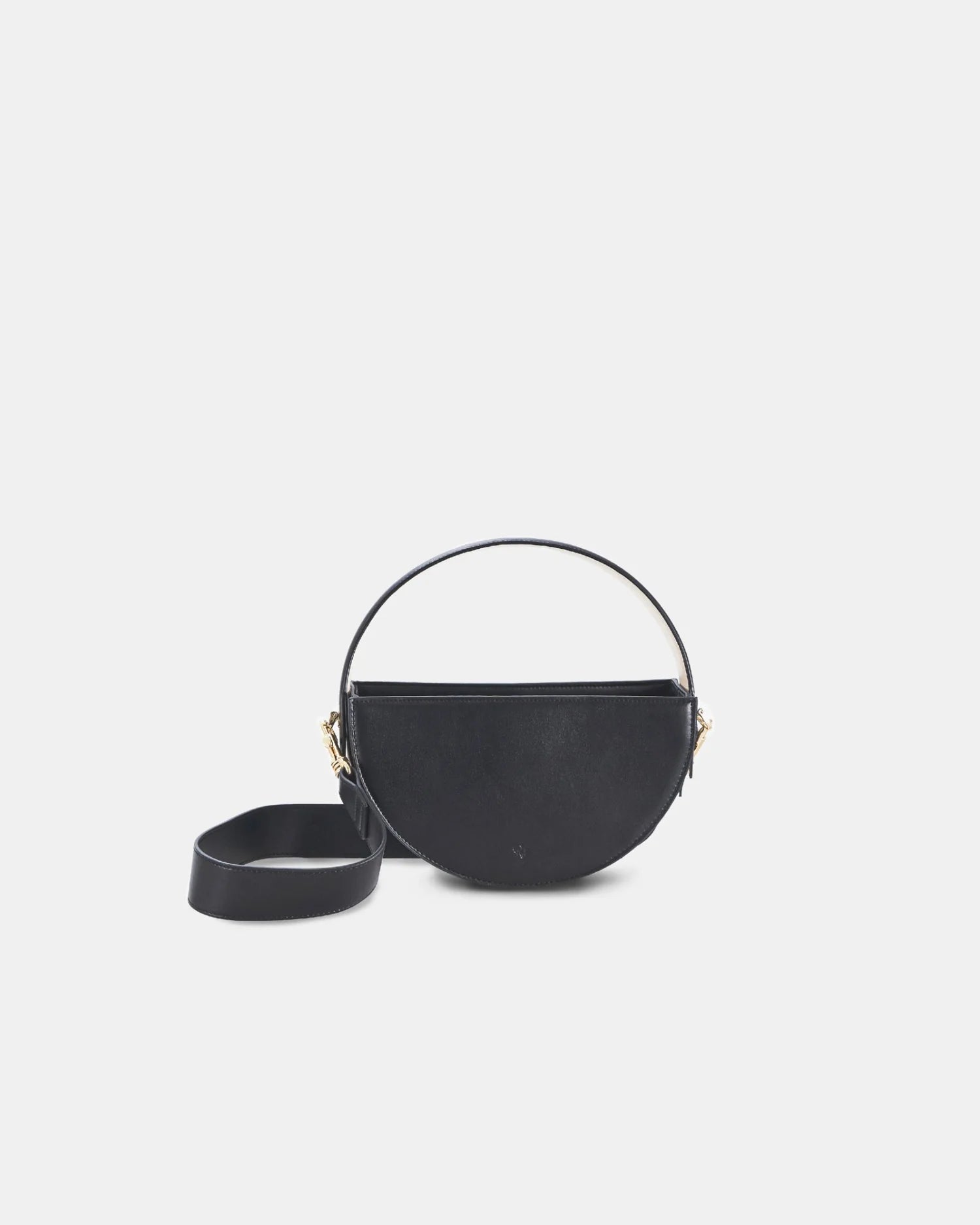 エレガントなミニバッグ。ラウンド型のハンドバッグに、幅広のショルダーストラップを取り外しすることで2WAYで使用できます。